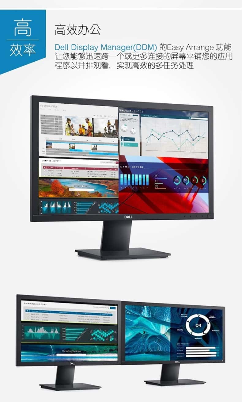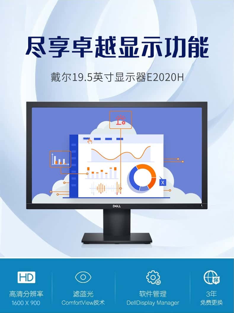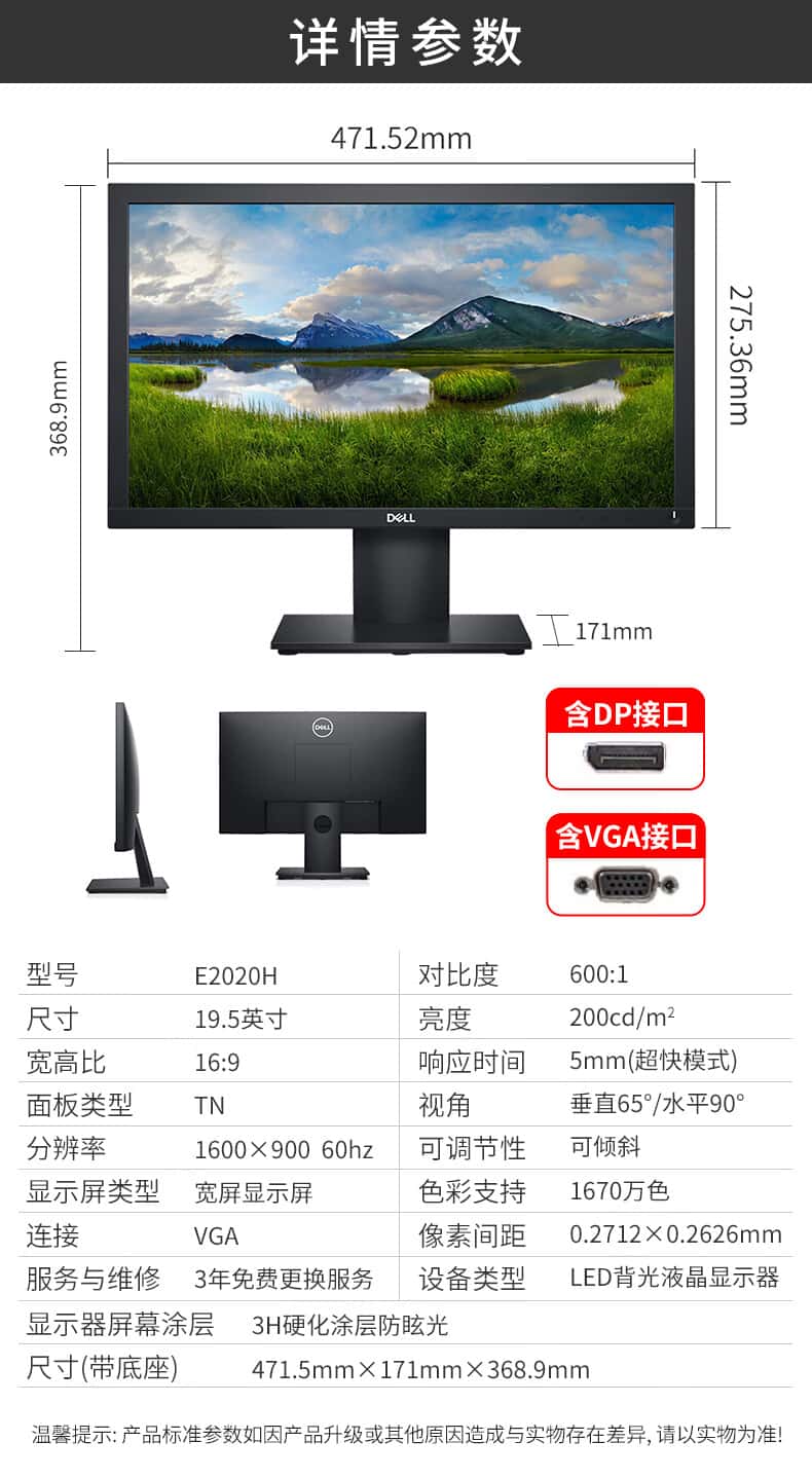 戴尔(DELL)E2020H办公商务显示器19.5英寸DP+VGA接口防眩光TN屏倾斜可调整
