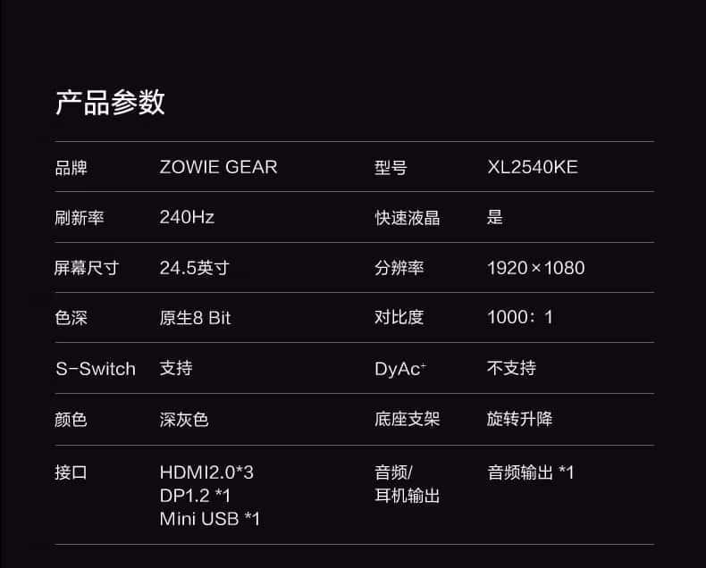ZOWIE卓威24.5英寸240Hz电竞显示器0.5ms响应CSGO吃鸡游戏显示屏旋转升降电脑显示器TN屏XL2540KE