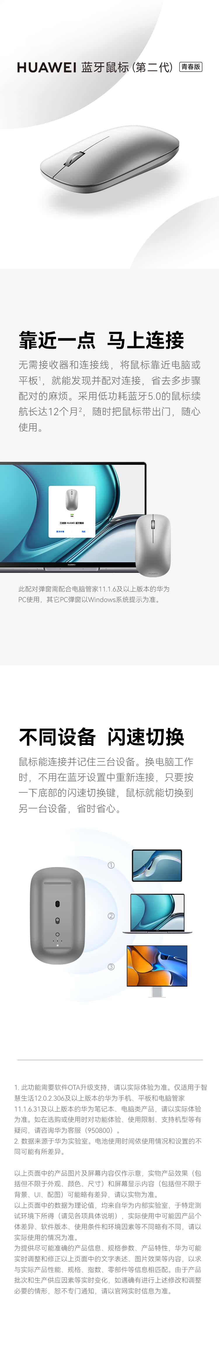 华为蓝牙鼠标(第二代)青春版无线鼠标台式机笔记本鼠标适配MateBook全系笔记本电脑银色